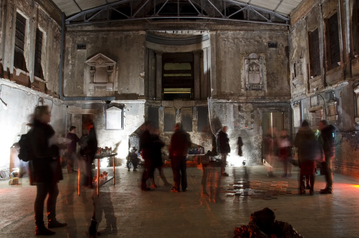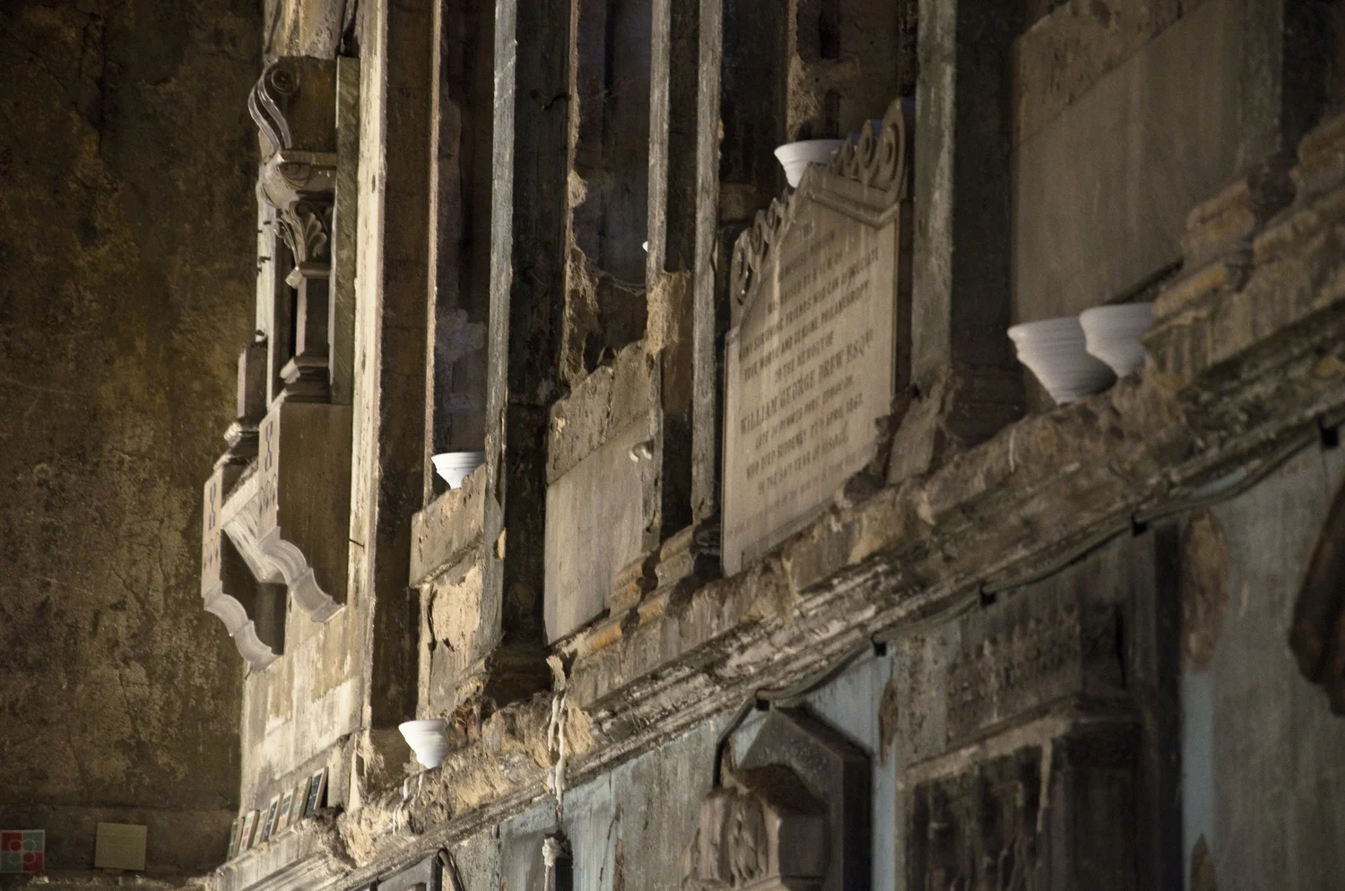 Second Year Ceramics and Glass students from the Royal College of Art respond to a derelict chapel in South London. The chapel was bombed in WWII providing a decayed backdrop for my porcelain tableware. Here I subvert the functionality of my work by placing it out of reach among the stained glass windows and stone ledges.